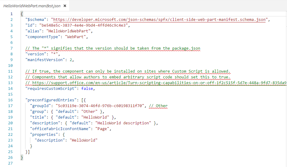 HelloWorldWebPart.manifest.json holds the metadata of web part such as display name, description, icon, version, id.