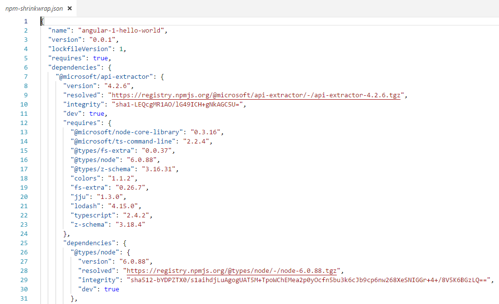 Because of using npm shrinkwrap, if npm install or npm update commands are used against the solution containing npm-shrinkwrap.json will restore the exact version of packages and avoids code break issues for other developers.