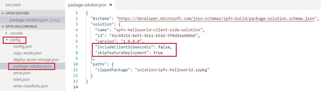 - Open package-solution.json file from config folder. This file takes care of solution packaging.