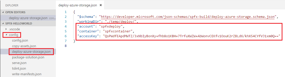 - Open deploy-azure-storage.json from config folder to specify the Azure storage account details.