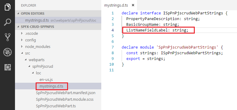 - Open mystrings.d.ts under “\src\webparts\spPnPjscrud\loc" folder.