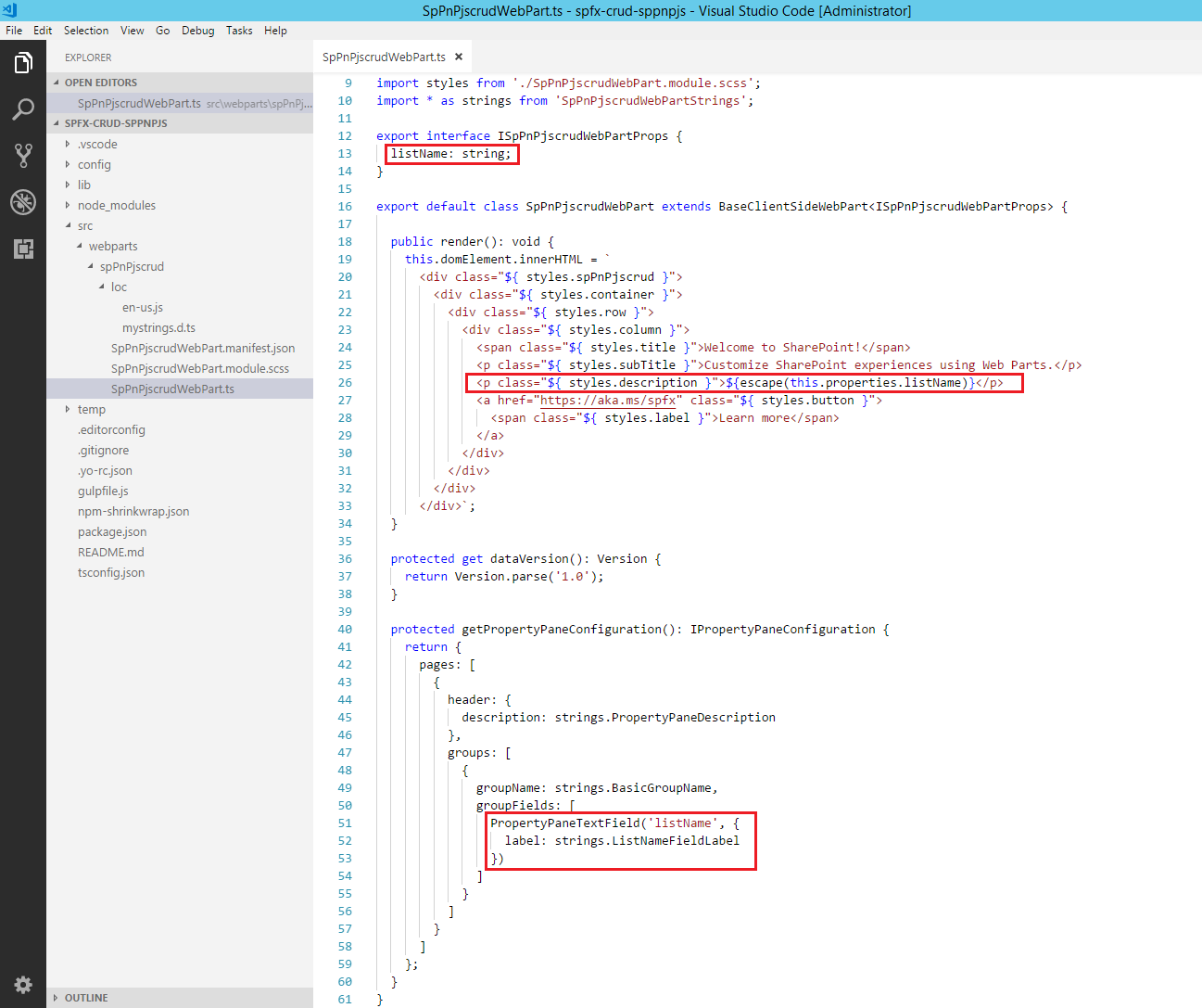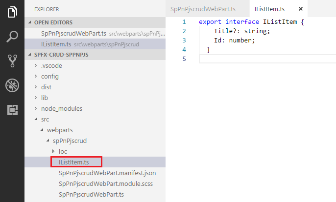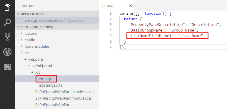 define([], function() { return { "PropertyPaneDescription": "Description", "BasicGroupName": "Group Name", "DescriptionFieldLabel": "Description Field" } }); - Open main webpart file (SpPnPjscrudWebPart.ts) under “\src\webparts\spPnPjscrud” folder.