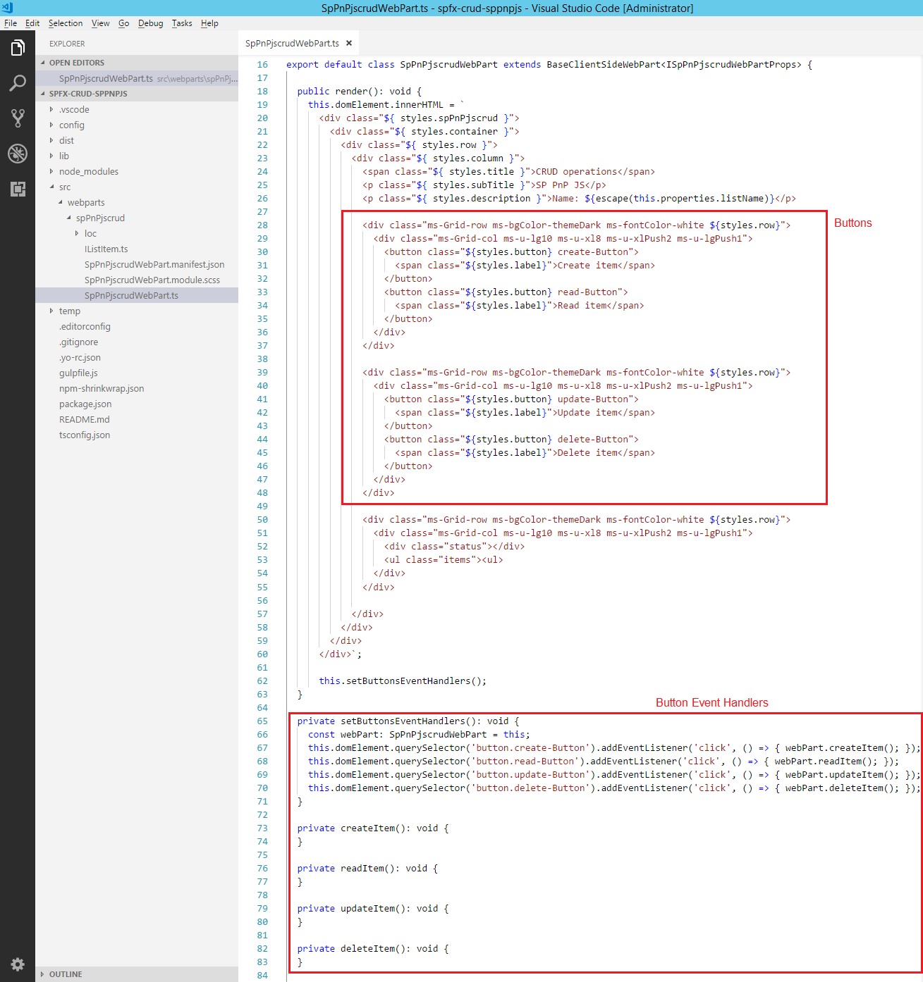 export default class SpPnPjscrudWebPart extends BaseClientSideWebPart<ISpPnPjscrudWebPartProps> { public render(): void { this.domElement.innerHTML = ` <div class="${ styles.spPnPjscrud }"> <div class="${ styles.container }"> <div class="${ styles.row }"> <div class="${ styles.column }"> <span class="${ styles.title }">CRUD operations</span> <p class="${ styles.subTitle }">SP PnP JS</p> <p class="${ styles.description }">Name: ${escape(this.properties.listName)}</p> <div class="ms-Grid-row ms-bgColor-themeDark ms-fontColor-white ${styles.row}"> <div class="ms-Grid-col ms-u-lg10 ms-u-xl8 ms-u-xlPush2 ms-u-lgPush1"> <button class="${styles.button} create-Button"> <span class="${styles.label}">Create item</span> </button> <button class="${styles.button} read-Button"> <span class="${styles.label}">Read item</span> </button> </div> </div> <div class="ms-Grid-row ms-bgColor-themeDark ms-fontColor-white ${styles.row}"> <div class="ms-Grid-col ms-u-lg10 ms-u-xl8 ms-u-xlPush2 ms-u-lgPush1"> <button class="${styles.button} update-Button"> <span class="${styles.label}">Update item</span> </button> <button class="${styles.button} delete-Button"> <span class="${styles.label}">Delete item</span> </button> </div> </div> <div class="ms-Grid-row ms-bgColor-themeDark ms-fontColor-white ${styles.row}"> <div class="ms-Grid-col ms-u-lg10 ms-u-xl8 ms-u-xlPush2 ms-u-lgPush1"> <div class="status"></div> <ul class="items"><ul> </div> </div> </div> </div> </div> </div>`; this.setButtonsEventHandlers(); } private setButtonsEventHandlers(): void { const webPart: SpPnPjscrudWebPart = this; this.domElement.querySelector('button.create-Button').addEventListener('click', () => { webPart.createItem(); }); this.domElement.querySelector('button.read-Button').addEventListener('click', () => { webPart.readItem(); }); this.domElement.querySelector('button.update-Button').addEventListener('click', () => { webPart.updateItem(); }); this.domElement.querySelector('button.delete-Button').addEventListener('click', () => { webPart.deleteItem(); }); } private updateItemsHtml(items: IListItem[]): void { } private readItem(): void { } private updateItem(): void { } private deleteItem(): void { } protected get dataVersion(): Version { return Version.parse('1.0'); } protected getPropertyPaneConfiguration(): IPropertyPaneConfiguration { return { pages: [ { header: { description: strings.PropertyPaneDescription }, groups: [ { groupName: strings.BasicGroupName, groupFields: [ PropertyPaneTextField('listName', { label: strings.ListNameFieldLabel }) ] } ] } ] }; } } -