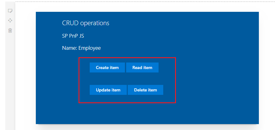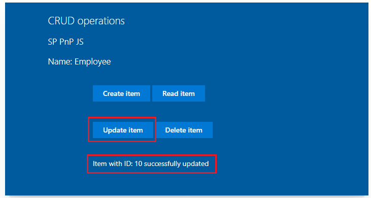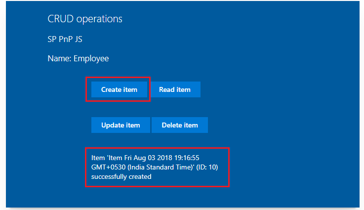 - Click the buttons (Create Item, Read Item, Update Item, and Delete Item) one by one to test the web part.