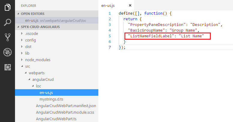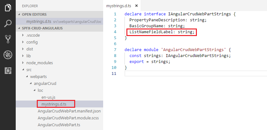 - Open mystrings.d.ts under “\src\webparts\angularCrud\loc" folder.