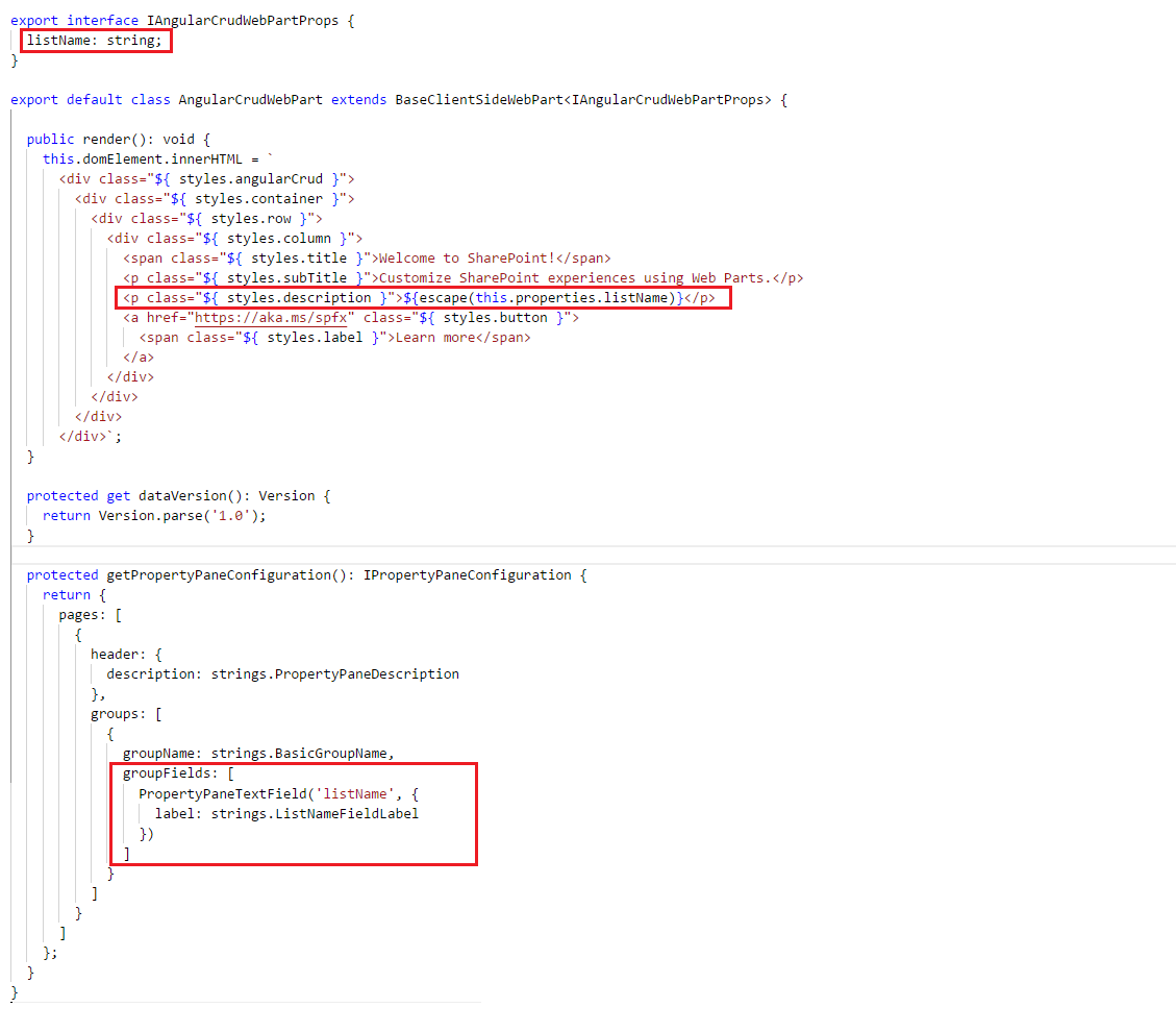 export interface IAngularCrudWebPartProps { listName: string; } export default class AngularCrudWebPart extends BaseClientSideWebPart<IAngularCrudWebPartProps> { public render(): void { this.domElement.innerHTML = ` <div class="${ styles.angularCrud }"> <div class="${ styles.container }"> <div class="${ styles.row }"> <div class="${ styles.column }"> <span class="${ styles.title }">Welcome to SharePoint!</span> <p class="${ styles.subTitle }">Customize SharePoint experiences using Web Parts.</p> <p class="${ styles.description }">${escape(this.properties.listName)}</p> <a href="https://aka.ms/spfx" class="${ styles.button }"> <span class="${ styles.label }">Learn more</span> </a> </div> </div> </div> </div>`; } protected get dataVersion(): Version { return Version.parse('1.0'); } protected getPropertyPaneConfiguration(): IPropertyPaneConfiguration { return { pages: [ { header: { description: strings.PropertyPaneDescription }, groups: [ { groupName: strings.BasicGroupName, groupFields: [ PropertyPaneTextField('listName', { label: strings.ListNameFieldLabel }) ] } ] } ] }; } } - On the command prompt, type