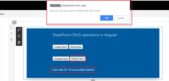 - Click the buttons (Create Item, Read Item, Update Item, and Delete Item) one by one to test the webpart.