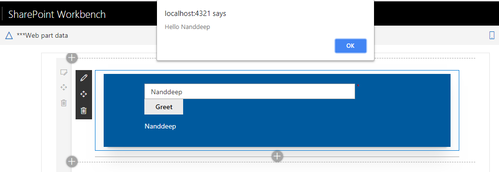 Enter text in TextBox component, click Greet button. An alert should appear greeting the value entered in textbox