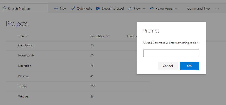public onExecute(event: IListViewCommandSetExecuteEventParameters): void { switch (event.itemId) { case 'COMMAND_1': Dialog.alert(`Clicked ${this.properties.sampleTextOne}`); break; case 'COMMAND_2': Dialog.prompt(`Clicked ${strings.Command2}. Enter something to alert:`).then((value: string) => { Dialog.alert(value); }); break; default: throw new Error('Unknown command'); } } -