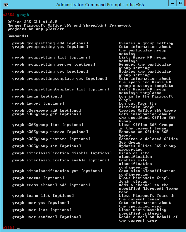 This will start the Office 365 CLI with its own command prompt: