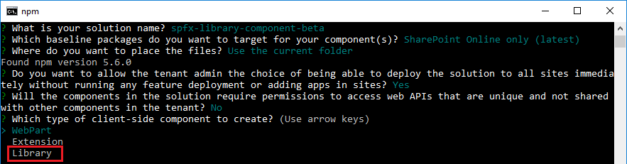 - Solution Name: Hit enter to have default name (spfx-library-component-beta in this case) or type in any other name for your solution.