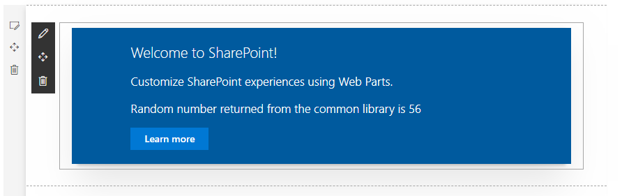 public render(): void { const myInstance = new myCommonLibrary.CommonLibraryLibrary(); this.domElement.innerHTML = ` <div class="${ styles.libraryConsumerWebPart }"> <div class="${ styles.container }"> <div class="${ styles.row }"> <div class="${ styles.column }"> <span class="${ styles.title }">Welcome to SharePoint!</span> <p class="${ styles.subTitle }">Customize SharePoint experiences using Web Parts.</p> <p>${myInstance.getRandomNumber()}</p> <a href="https://aka.ms/spfx" class="${ styles.button }"> <span class="${ styles.label }">Learn more</span> </a> </div> </div> </div> </div>`; }