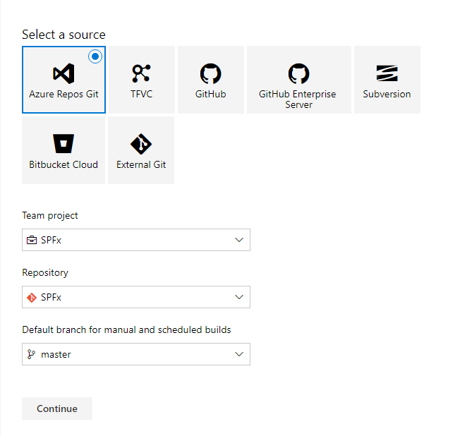 Select the source to connect to your source repository. Click continue.