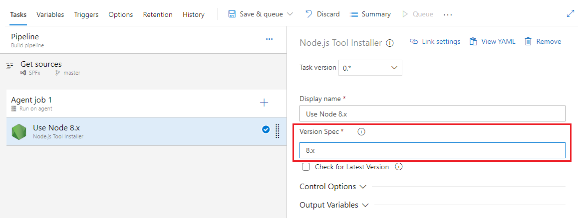 Specify the version as 8.x, since SharePoint Framework supports Node version 8.x.