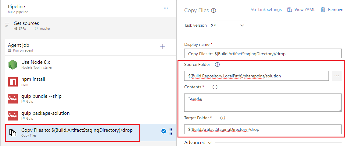 Azure DevOps build does not retain any files. The .sppkg file created from above step needs to be copied to staging directory to be published to release pipeline.