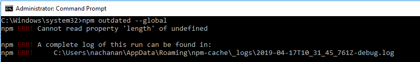 There have been few challenges recently with npm to find out the outdated packages. The npm outdated command fails to get the outdated packages. The error will say: Cannot read property 'length' of undefined.