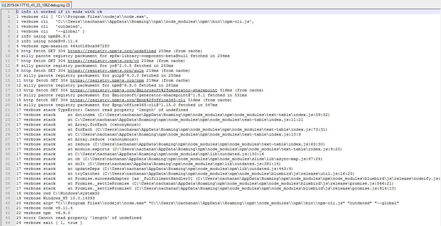 The complete error log is available at mentioned location under “AppData\Roaming\npm-cache_logs”. However it does not help to clearly understand the exact cause of issue and its resolution.