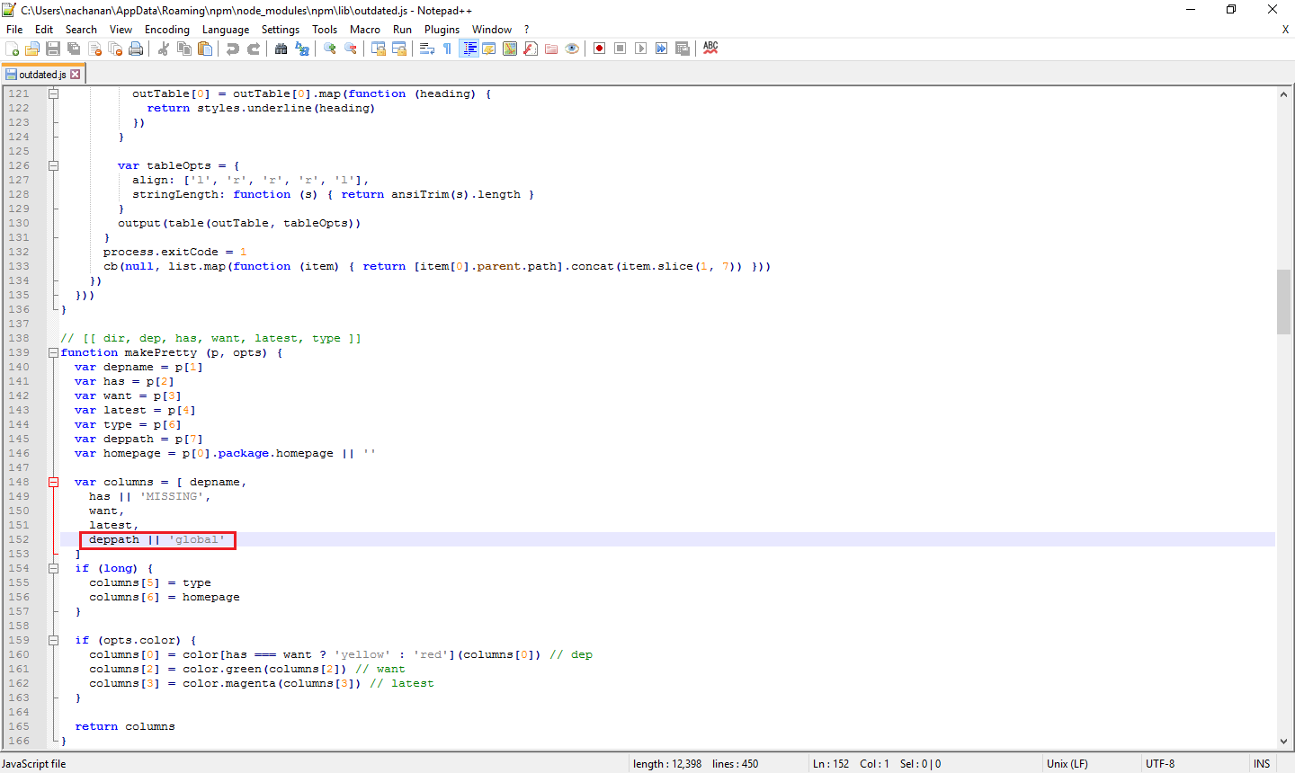 The npm packages installed globally are available at “C:\Users<user-name>\AppData\Roaming\npm\node_modules". Manually edit the “lib/outdated.js” file located at the “npm/node_modules/npm” path. (E.g. C:\Users\nachanan\AppData\Roaming\npm\node_modules\npm\lib\outdated.js)