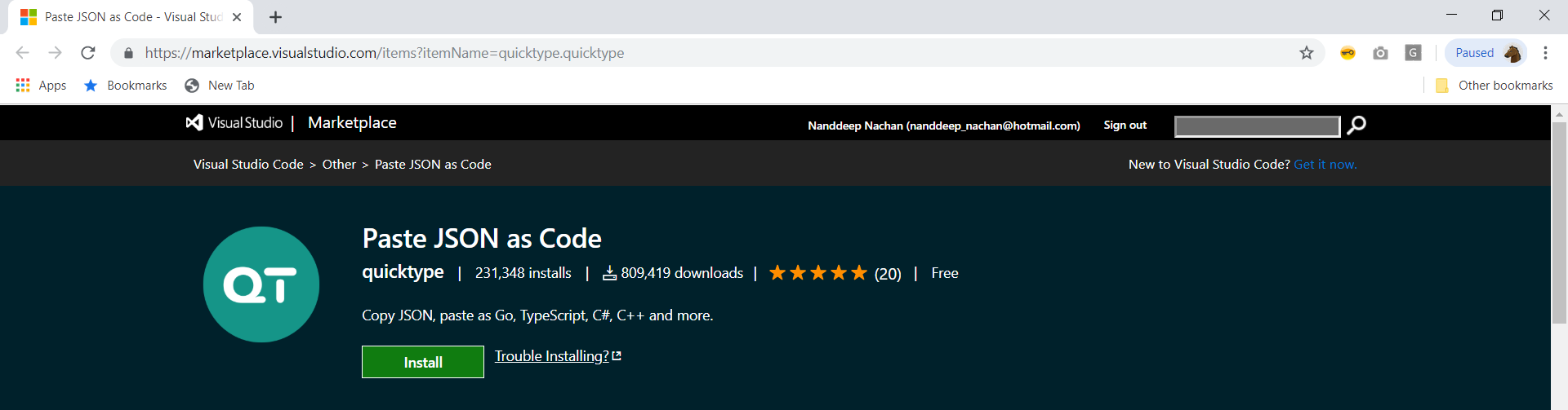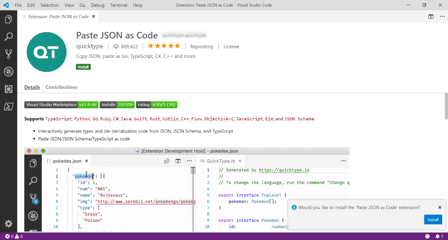 Navigate to https://marketplace.visualstudio.com/items?itemName=quicktype.quicktype