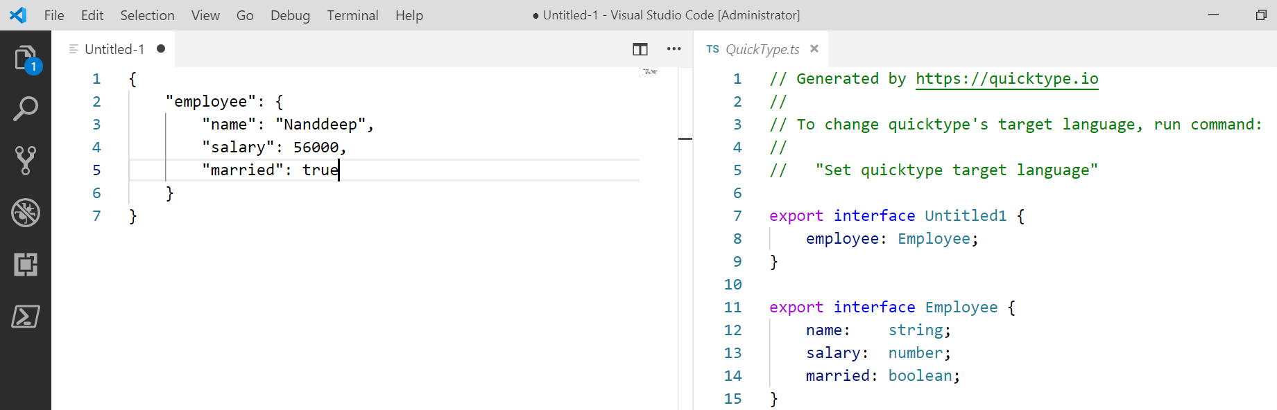 - Select Open quicktype for JSON.