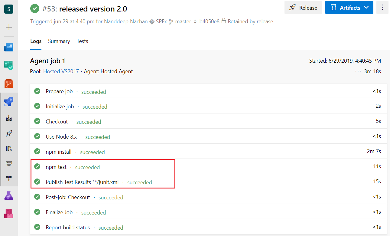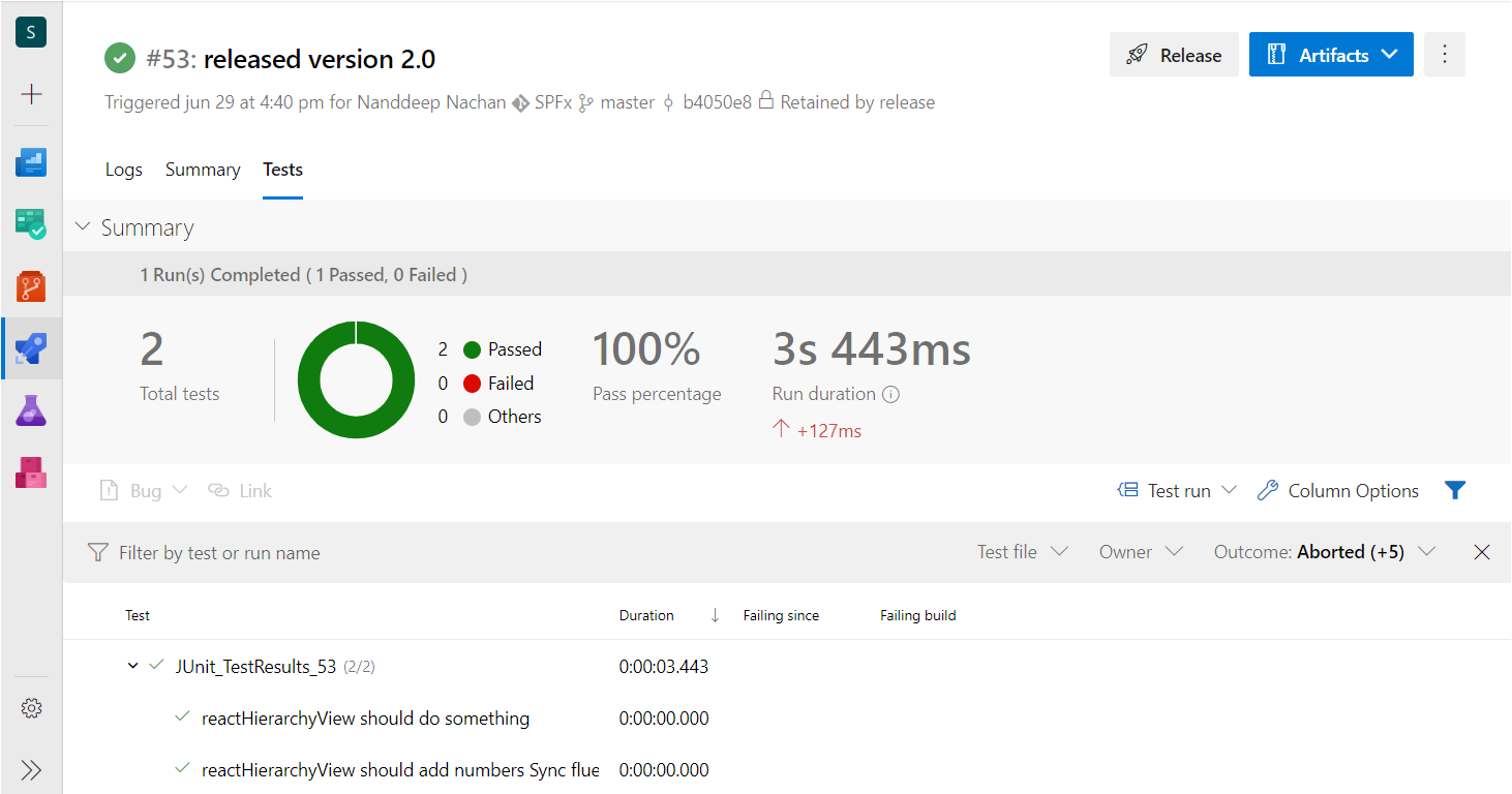 The test cases help to validate the SPFx solutions for each of its releases. The test cases can be implemented using Jest and Enzyme. We can automate running the test cases using Azure DevOps. The test outcome from Azure DevOps summarizes the number of passed and failed test cases. Although the test cases fail, build may continue further with the packaging and deployment.