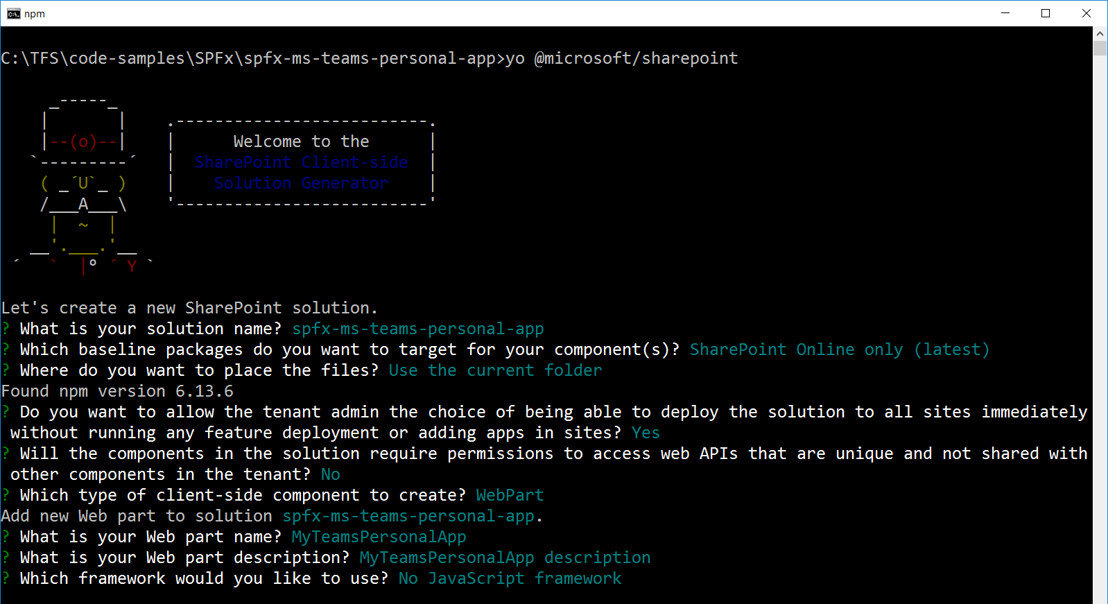 - Accept the default spfx-ms-teams-personal-app as your solution name, and then select Enter.