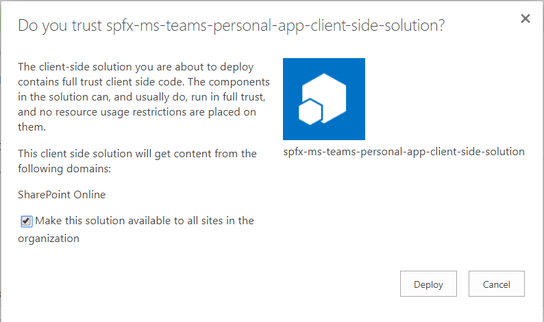 Ensure that the Make this solution available to all sites in the organization option is selected, so that the web part can be used from the Microsoft Teams side.