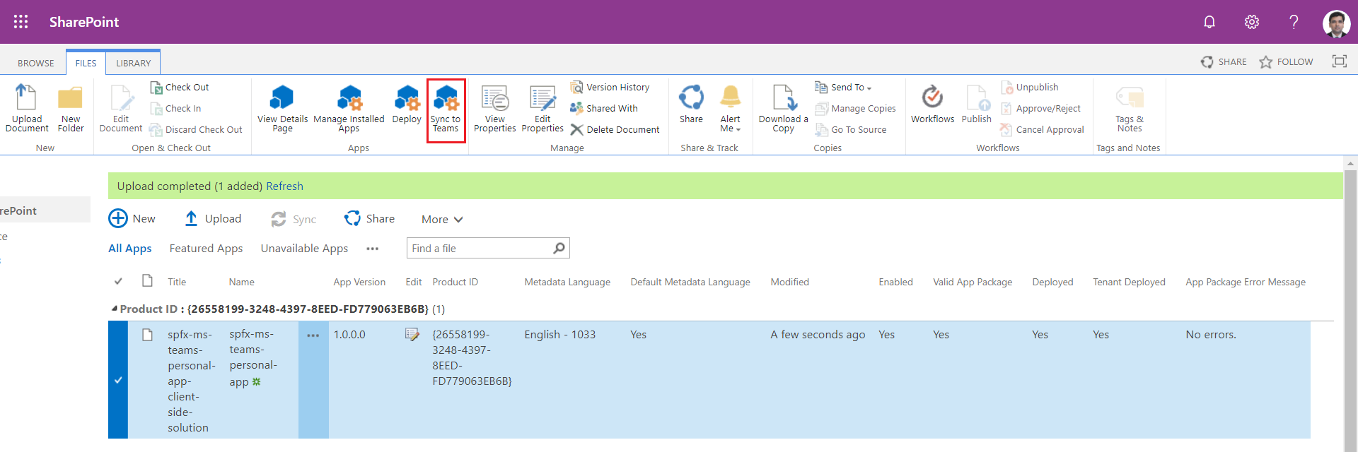 - Select the spfx-ms-teams-personal-app package in the SharePoint tenant App Catalog and click the Sync to Teams button in the ribbon at the Files tab to make the web part available in Microsoft Teams.
