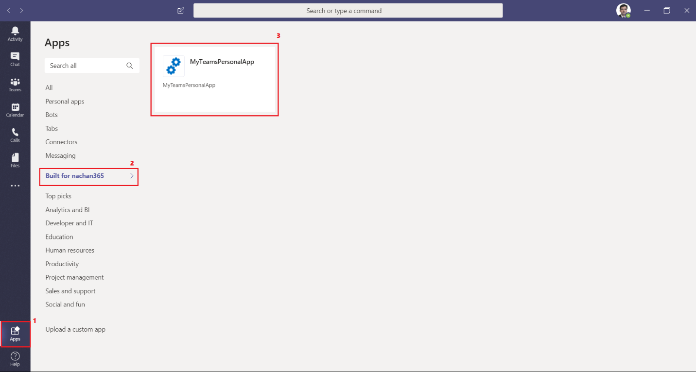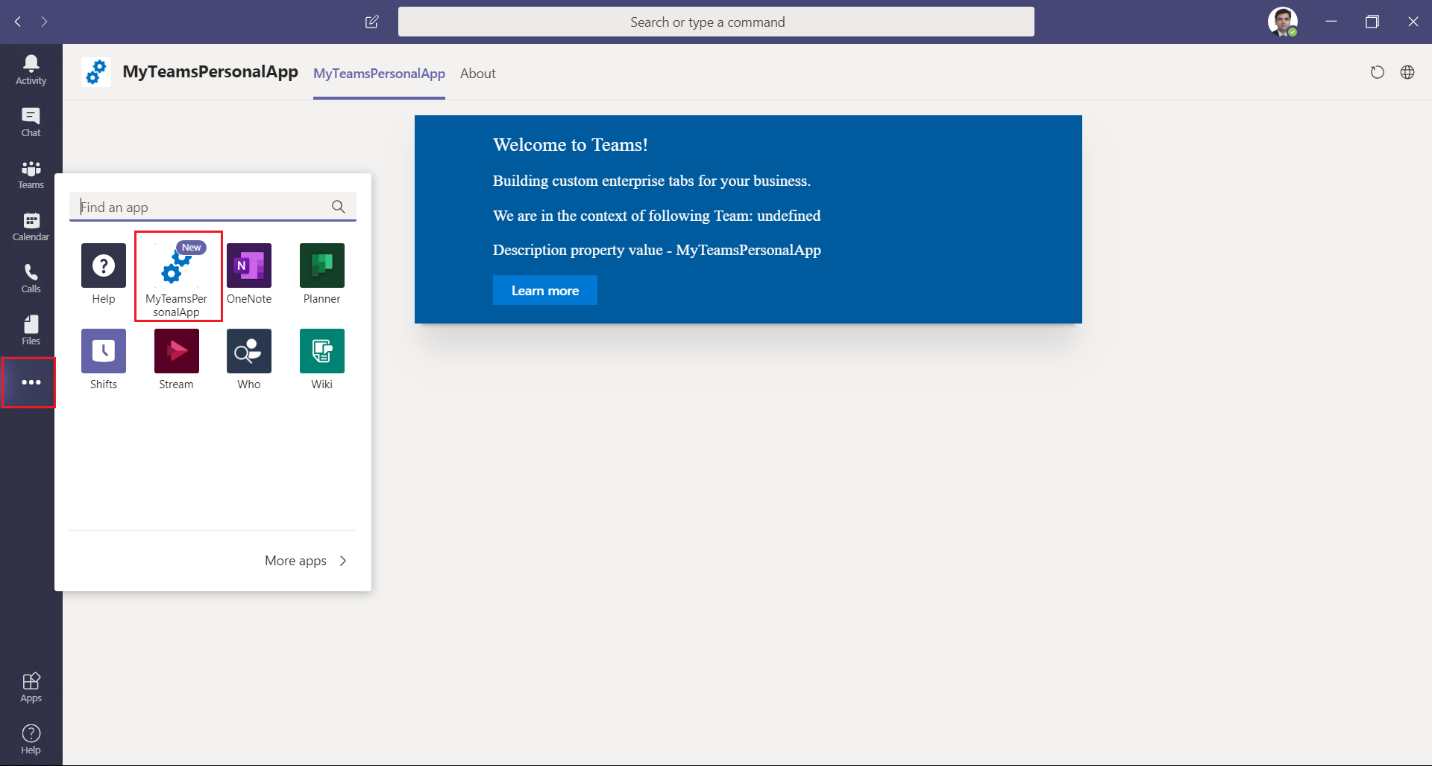 A personal app is an app with a personal scope. As a developer, you can develop a version of your app that is built for the individual user. It can have a collection of tabs and a bot. A personal app is available from the personal app flyout.