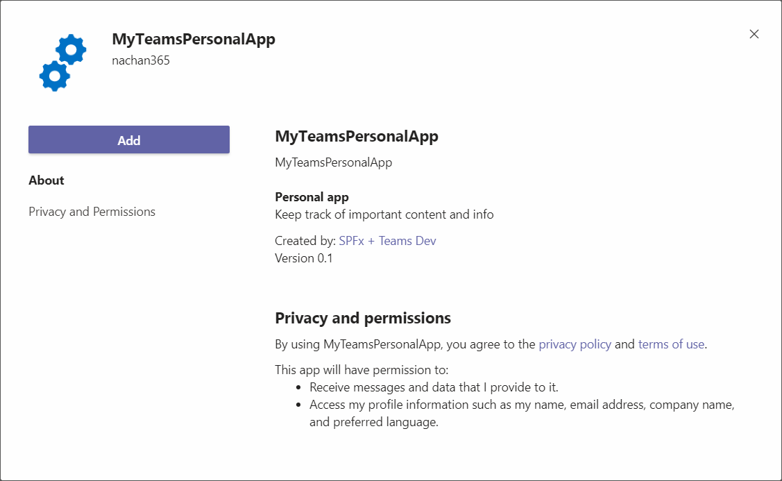 A personal app in MS Teams is an app with a personal scope. SPFx v1.10 now supports creating solutions in Microsoft Teams for building the personal app. Personal apps offer a view of your key application data from across teams and can either be acquired individually or deployed across Teams.
