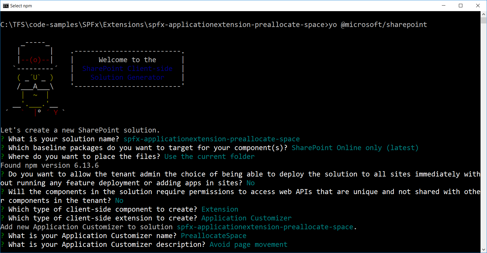 - Accept the default spfx-applicationextension-preallocate-space as your solution name, and then select Enter.
