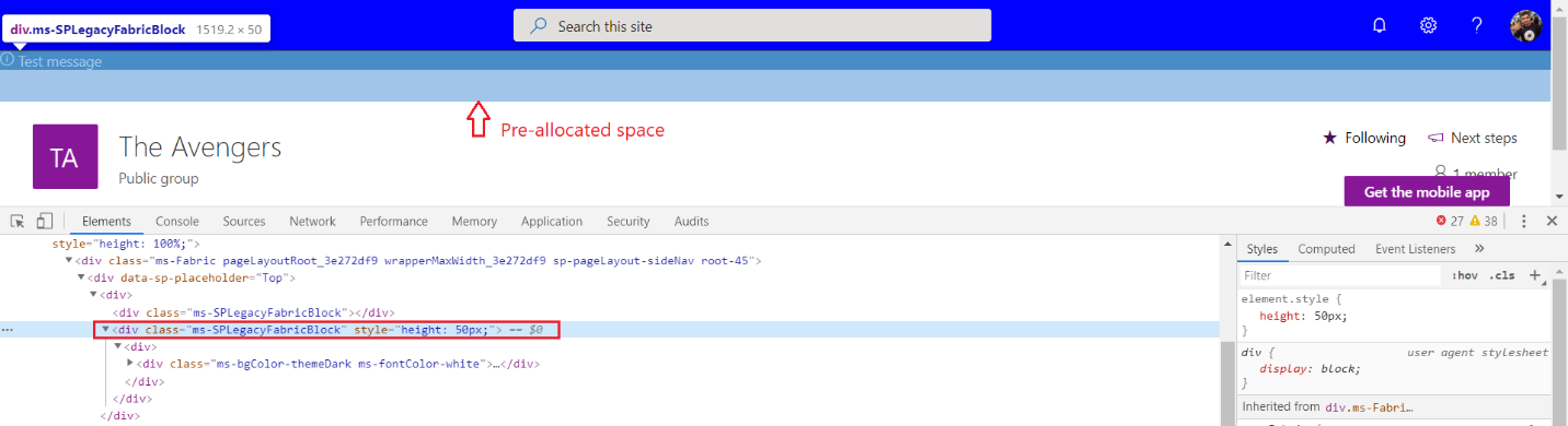 An application customizer pre-allocates the defined space on the server-side as shown below: