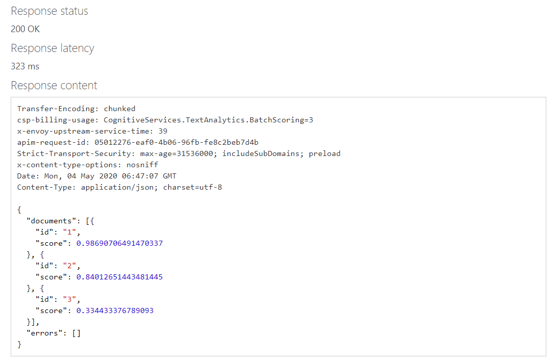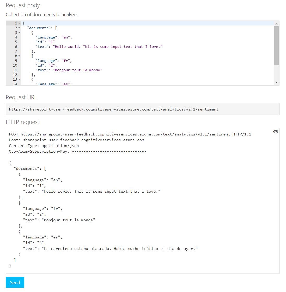 Azure Sentiment analysis API helps to analyze the text input submitted to SharePoint and evaluate the user input and returns the sentiment score in the range of 0 (negative) to 1 (positive).