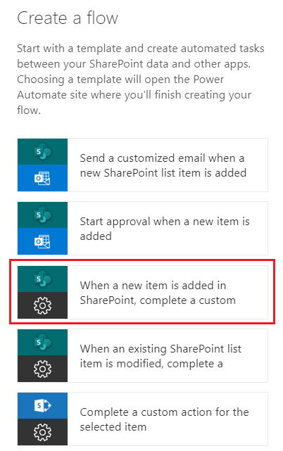 Select a template “When a new item is added in SharePoint, complete a custom”.