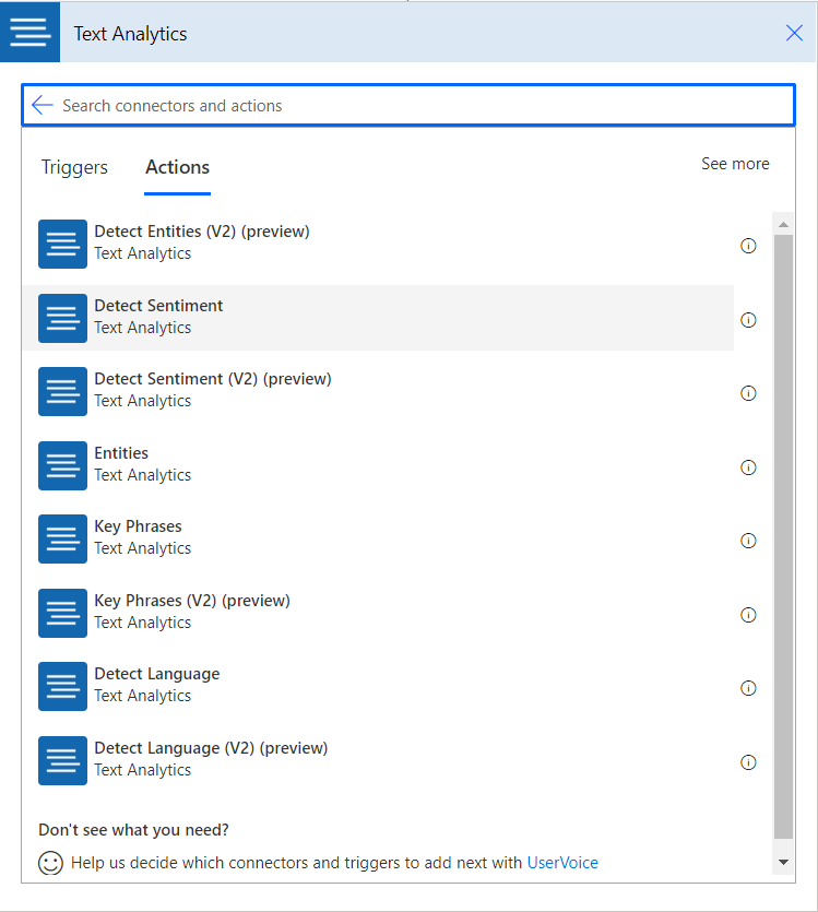 Add an activity “Text Analytics”, select action “Detect Sentiment”.