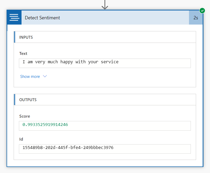 Add an entry to the SharePoint list. This will trigger a flow. The OUTPUTS section will show the Score from Text Analytics API.