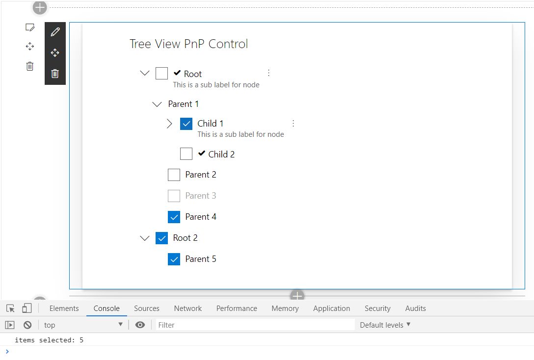 public render(): React.ReactElement<ITreeViewDemoProps> { return ( <div className={styles.treeViewDemo}> <div className={styles.container}> <div className={styles.row}> <div className={styles.column}> <span className={styles.title}>Tree View PnP Control</span> <TreeView items={this.treeItems} defaultExpanded={false} selectionMode={TreeViewSelectionMode.Multiple} selectChildrenIfParentSelected={true} showCheckboxes={true} treeItemActionsDisplayMode={TreeItemActionsDisplayMode.ContextualMenu} defaultSelectedKeys={['R2', '6']} onExpandCollapse={this.onExpandCollapseTree} onSelect={this.onItemSelected} onRenderItem={this.renderCustomTreeItem} /> </div> </div> </div> </div> ); }Use the TreeView control in the render method as follows.