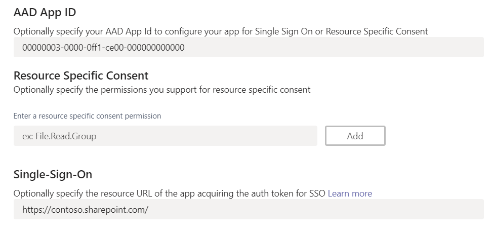 Add AAD App ID to set up a single sign-on (SSO). Specify AAD application ID as 00000003-0000-0ff1-ce00-000000000000 and Resource Url as {{subdomain}}.sharepoint.com