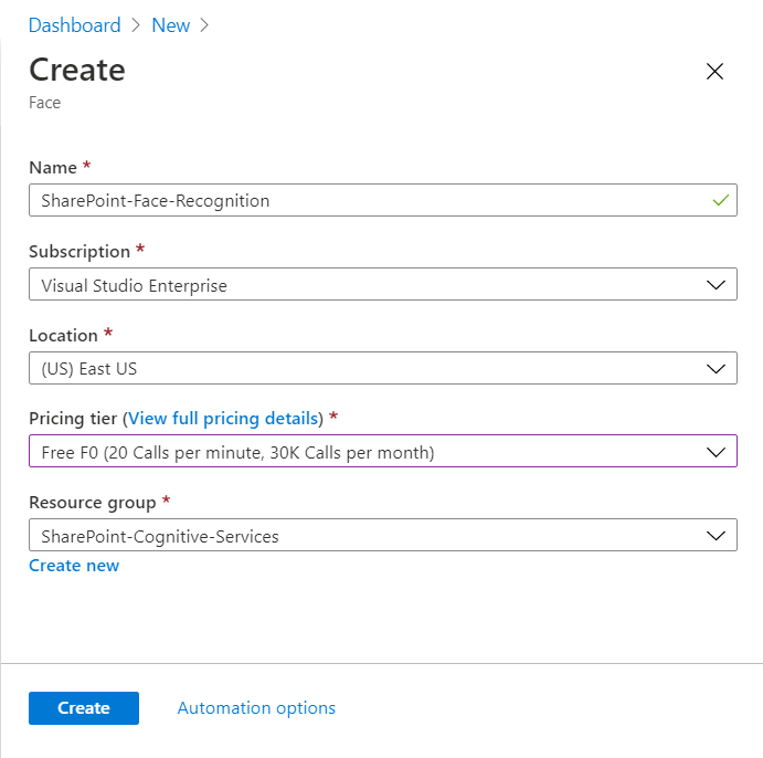 - Pricing tier: Select tier as per features you want to use. More details at https://azure.microsoft.com/en-us/pricing/details/cognitive-services/face-api/