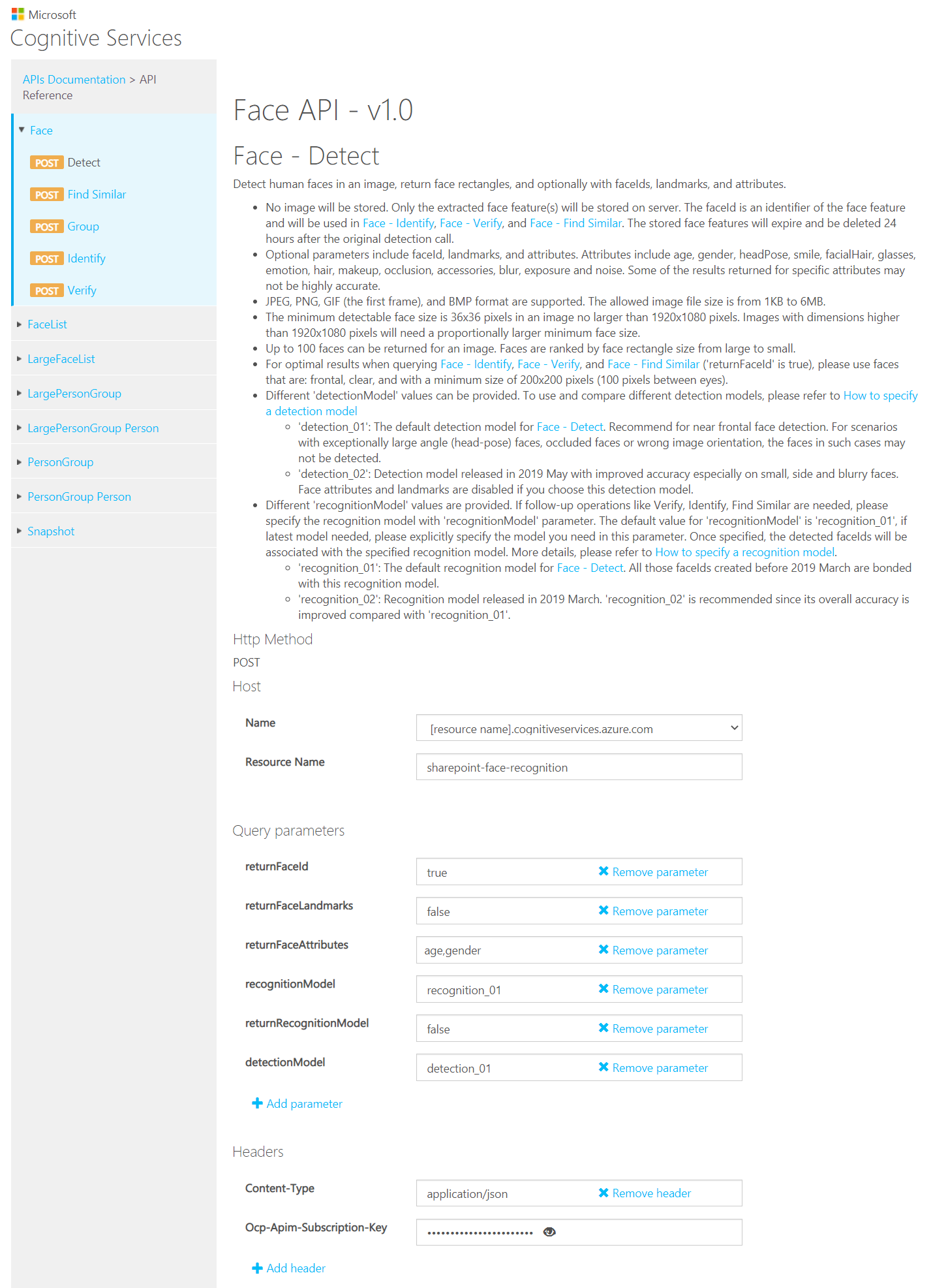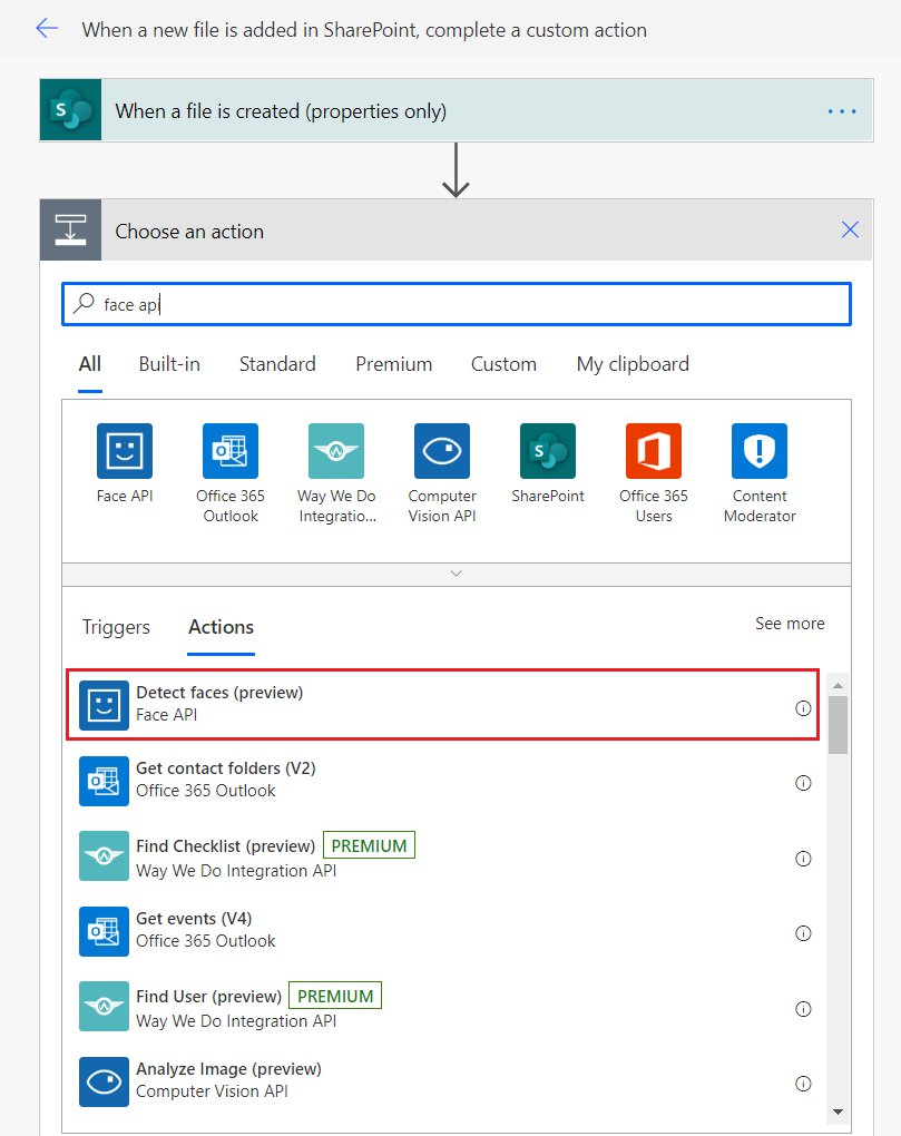 Add an activity “Face API”, select action “Detect faces (preview)”.