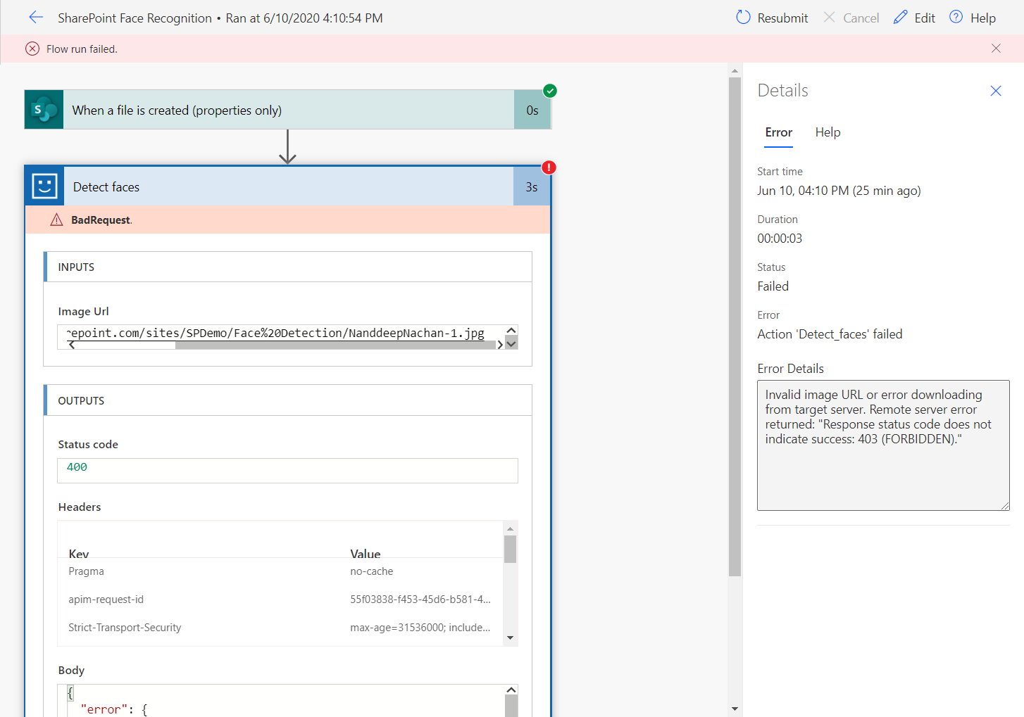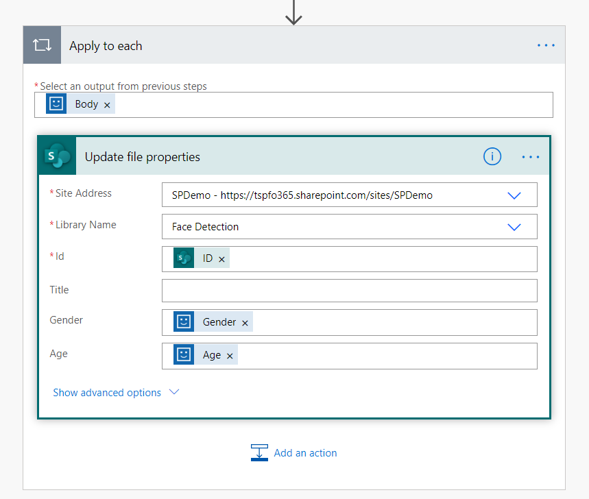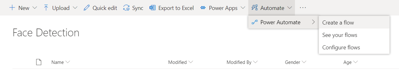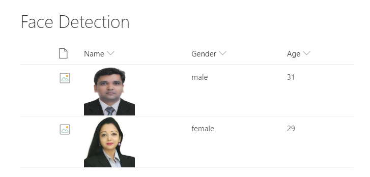 In the SharePoint library, upload a human image. This will trigger a flow. A flow will call Face API for analyzing the image uploaded to SharePoint. The flow will then update the returned metadata to the SharePoint column inside the library with gender and age.
