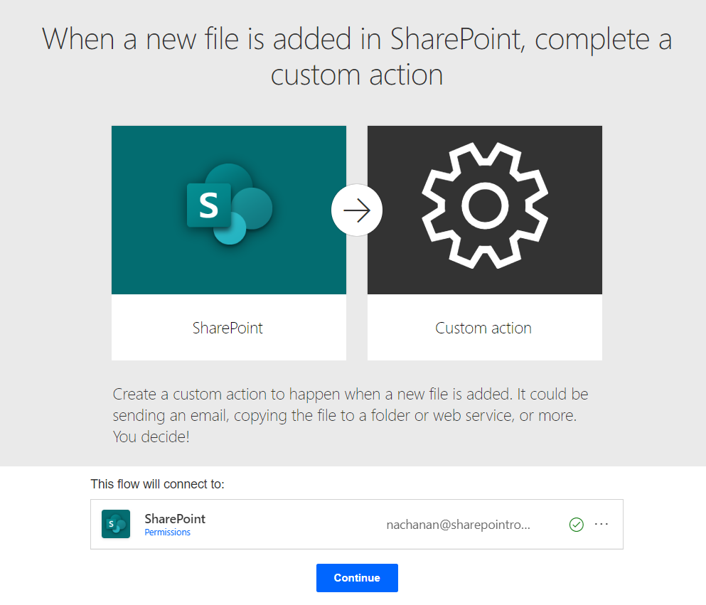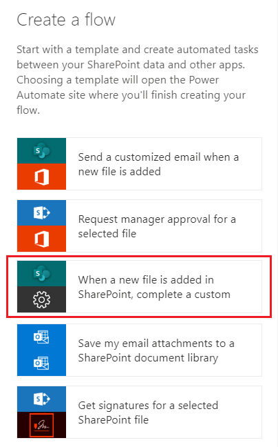 Select a template “When a new file is added in SharePoint, complete a custom”.