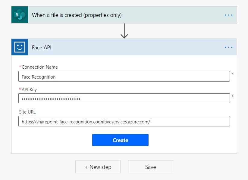 Specify the Connection Name, API Key, and Site URL from MS Azure Face API service.