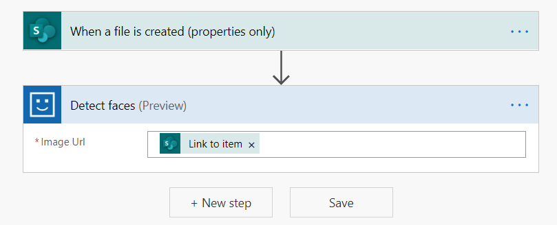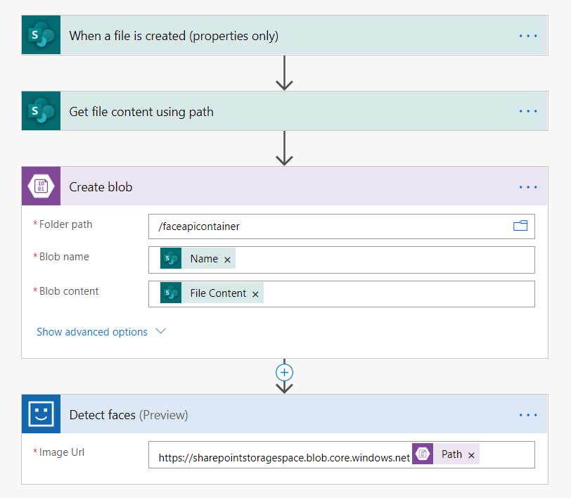 Add an action “Detect faces (Preview)”. Compose the Image Url as the URL of the storage account + Path to the uploaded file.