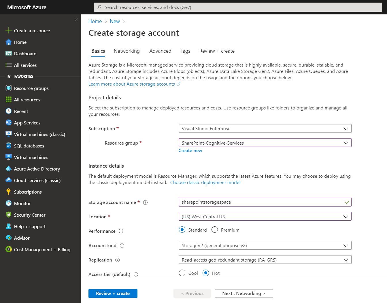 We will create a storage account inside MS Azure to temporarily hold the image uploaded to SharePoint.