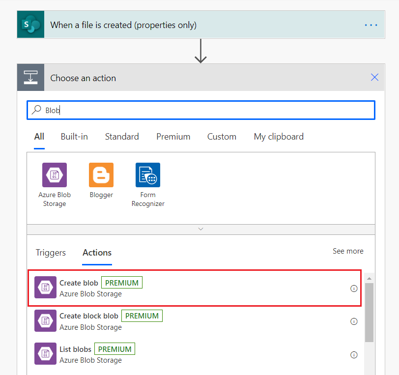 Add an activity “Azure Blob Storage”, select action “Create blob”.