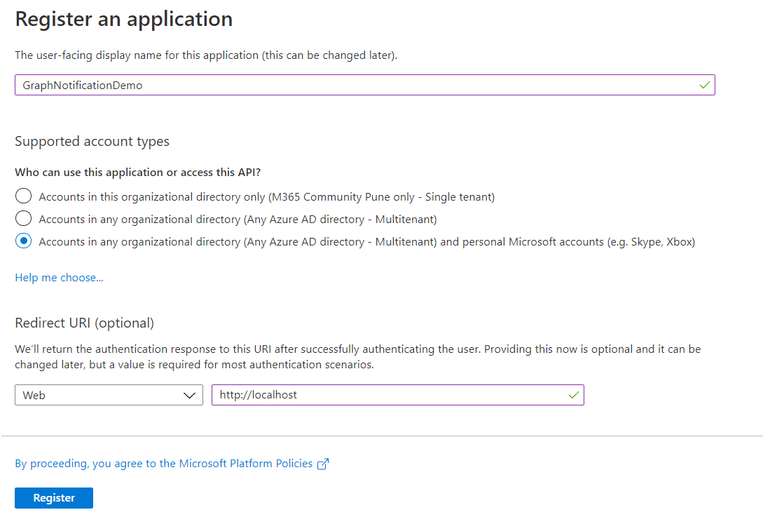 - Supported account types: Accounts in any organizational directory and personal Microsoft accounts