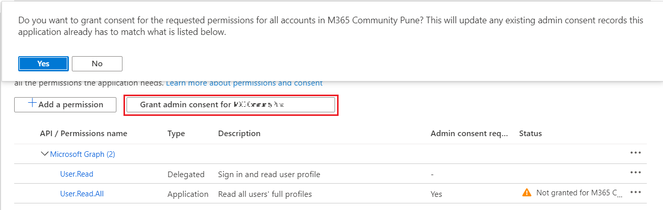 Select Grant admin consent for [tenant name], then select Yes to consent this application.