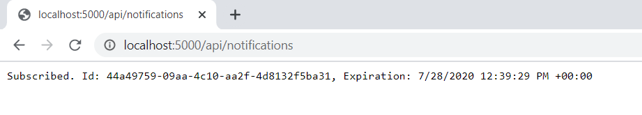 return $"Subscribed. Id: {newSubscription.Id}, Expiration: {newSubscription.ExpirationDateTime}";