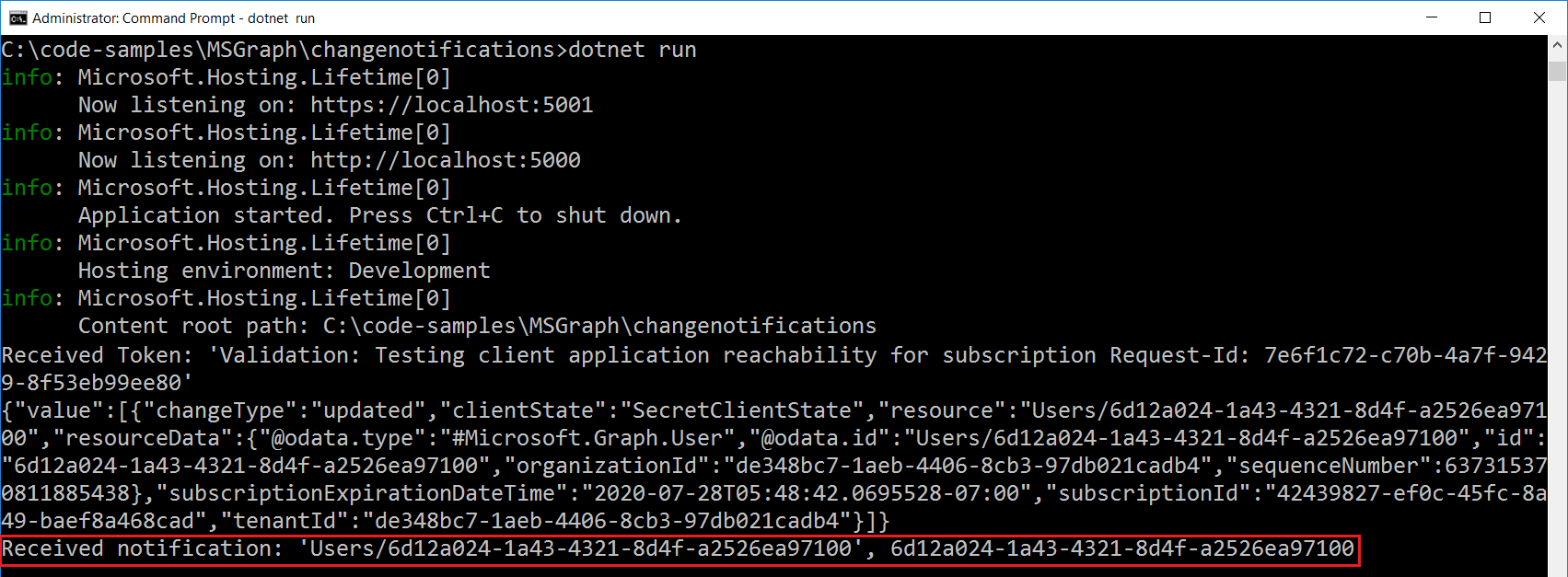 The application is now subscribed to receive notifications from the Microsoft Graph, when an update is made on any user in the Office 365 tenant.